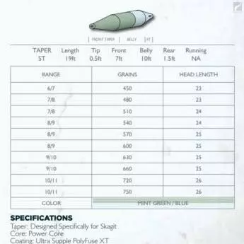 | Line Size | Grains | Length | Front Taper | Belly | Rear Taper | Loop Color |