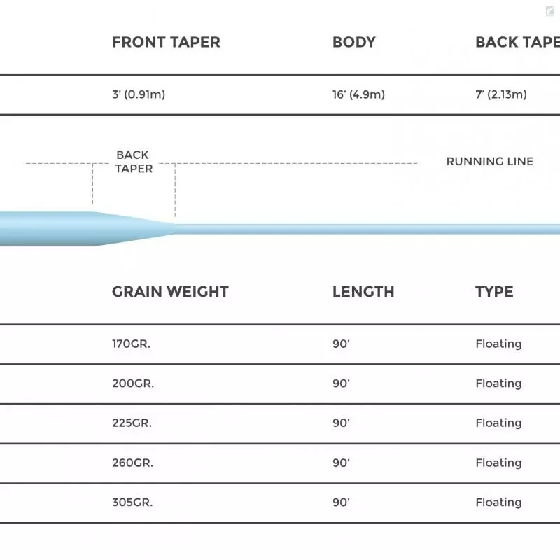 Measurements are shown below. Please note that the line weight is measured in accordance of AFTM standard, i.e. it shows the weight of the first 30 feet (9,14 m) of fly line: