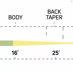 Measurements are shown below. Please note that the line weight is measured in accordance of AFTM standard, i.e. it shows the weight of the first 30 feet (9,14 m) of fly line: