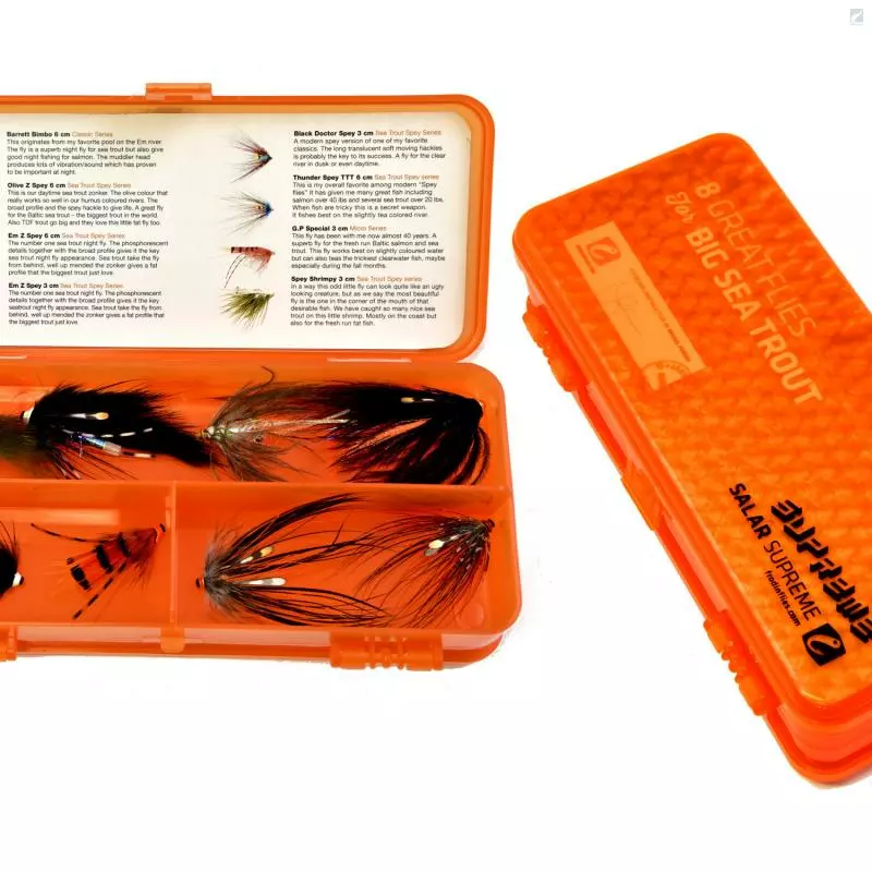 Frödinflies 8 Great Flies for Big Sea Trout – Here you find absolutely best sea trout flies. A great mix of flies for both daytime and night fishing. Mikael calls it a selection for BIG sea trout since all patterns have taken sea trout over magical 20 lbs. Presented in Frödinflies’ Slim Double SALAR Supreme box.