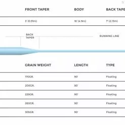 | Line size | Full head weight | 30′ head weight | Head length | Total length | Line color |