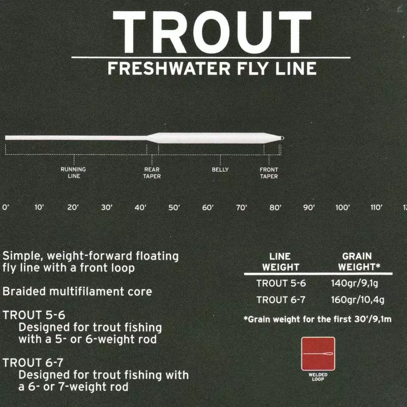 Scientific Angler’s AirCel Trout features all the properties needed in a fly line: good floatation, durability, and tapers that work well for trout, grayling and saltwater species. Trout #5/6 excels in virtually every situation where a floating fly line is needed. It works best with a #5 or #6 weight rod. Use Trout #6/7 with a #7 weight rod or fast-action #6 weight rod.