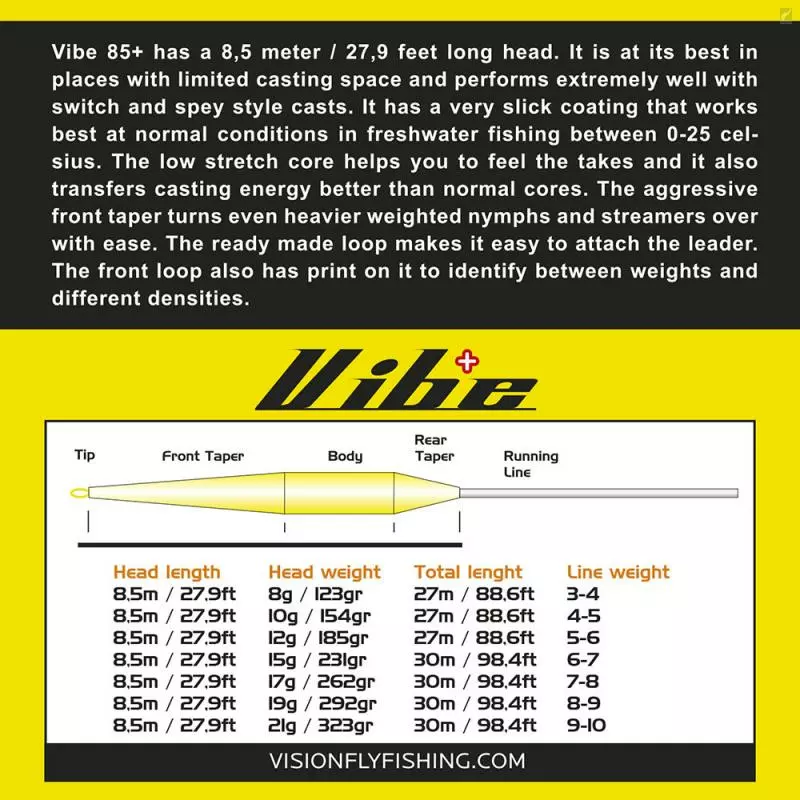 Vision Vibe 85+ has a 8,5 meter / 27,9 feet long head. The Vision Vibe 85+ is heavier compared to AFTM standard. Therefore, for example line which is suggested for rods #5–6, performs well in stiffer and more powerful #5 weight rods or softer #6 weight rods. It is at its best in places with limited casting space and performs extremely well with switch and spey style casts. The low stretch core helps you to feel the takes and it also transfers casting energy better than normal cores. The aggressive front taper turns even heavier weighted nymphs and streamers over with ease. The ready made loop makes it easy to attach the leader. Phthalate free.